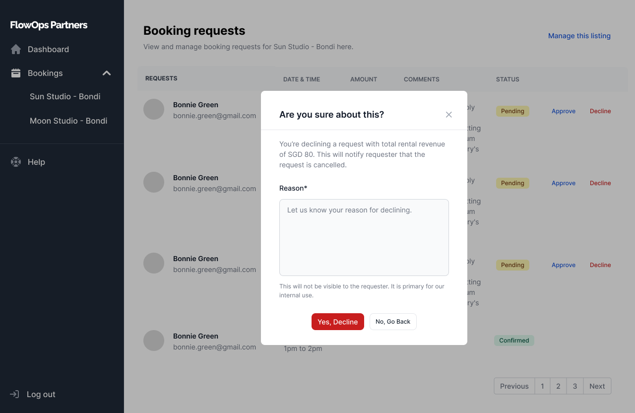 <figure><img src="https://2080870451-files.gitbook.io/~/files/v0/b/gitbook-x-prod.appspot.com/o/spaces%2FPrutaPacPTcQvlT6Wdi0%2Fuploads%2FkSSp2unYrlcppZvHGOAH%2FDeclineRequestConfirmation.png?alt=media&#x26;token=7b120c29-f6ef-42bc-b4a7-e43253a56dd0" alt=""><figcaption><p>The FlowOps Partners Dashboard - Declining a Booking Request</p></figcaption></figure>
